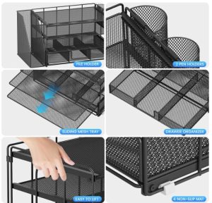 Organizadores de escritorio y accesorios, para espacio de trabajo, suministros de oficina, organizador de archivos con 2 soportes para bolígrafos, organizador de papeles de 4 niveles (negro)