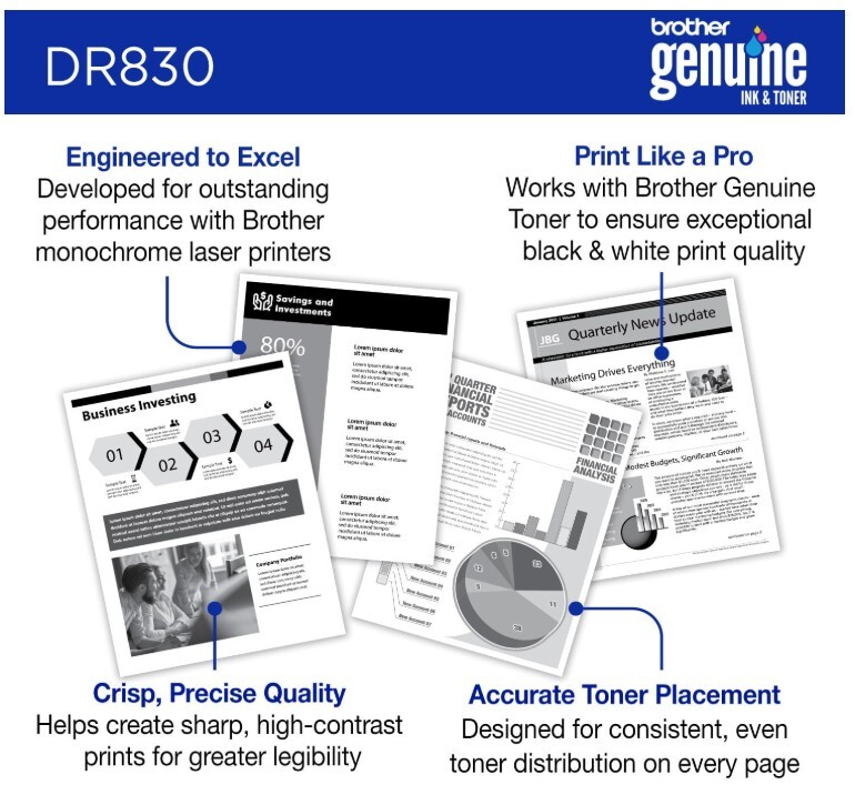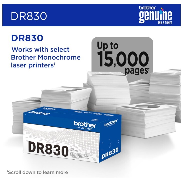 La unidad de tambor Brother ofrece impresiones nítidas en blanco y negro con hasta 15.000 páginas de rendimiento. Funciona con tóneres TN830 y TN835, garantiza flujo de tóner uniforme y promueve el reciclaje responsable mediante su programa ecológico.