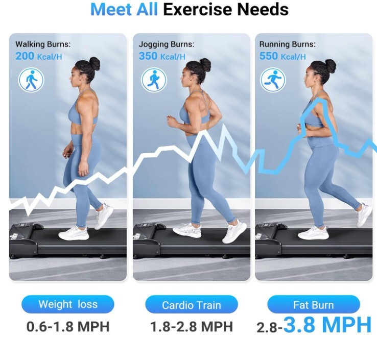 • Cinta de correr 2 en 1 para debajo del escritorio: hay 2 modos, se puede utilizar como una cinta de correr debajo del escritorio cuando se trabaja y se puede utilizar como una almohadilla para caminar al caminar. El rango de velocidad de 0.6-3.8 MPH te permite caminar o trotar y también te hace personalizar la intensidad de tu ejercicio en función de tu condición física y objetivos de acondicionamiento físico